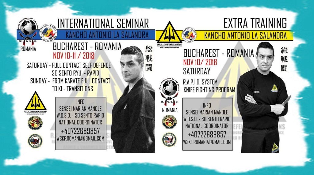 Federația Română de Autoapărare – W.O.S.D. România vă invita, la seminarul W.O.S.D. condus de Shihan Antonio la Salandra – instructor autoapărare în Poliția din Roma, președinte și instructor șef World Organization of Self Defence.